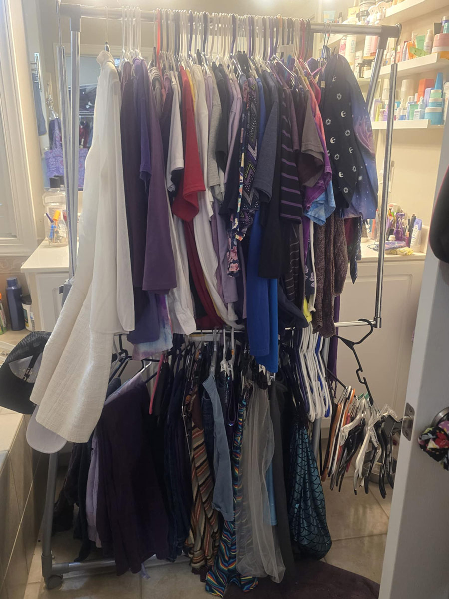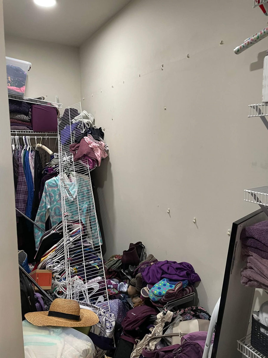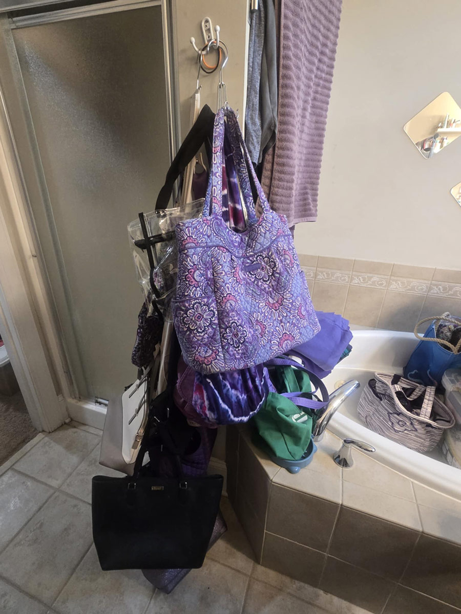 - Thankfully I had some existing organization in here that made this easier to manage. There were three plastic totes. Originally, they kept the closet door from opening all the way, but once I got their contents reassembled, it got a lot of stuff out of the way quickly. I had all of my handbags on a little hanger thing, so I could extricate all of them at once. And of course my garment rack came in clutch. It’s listing pretty hard to starboard, so I’m actually about to run to Lowes and grab a second one. Not a lot of junk or trash, which was kind of a surprise. I felt like this was an area where doom bags/boxes sometimes go to die.