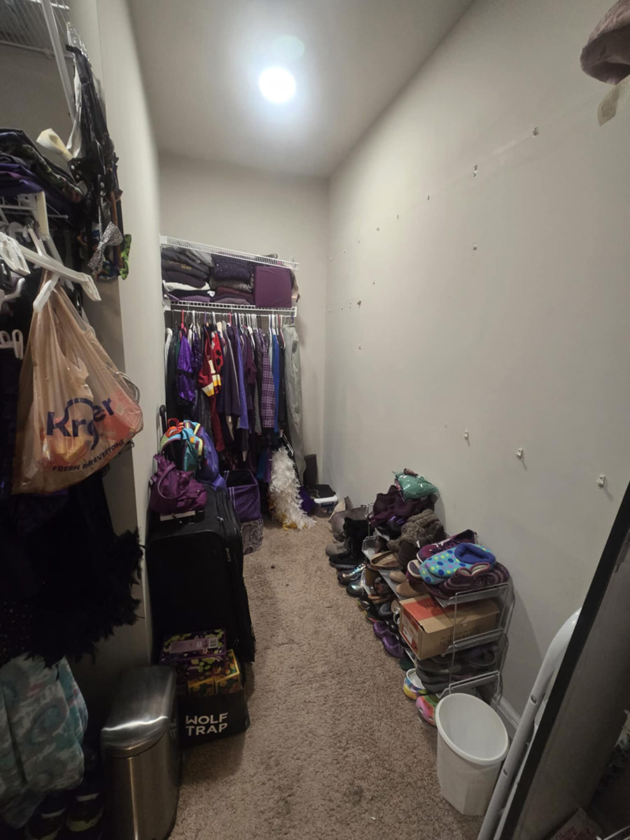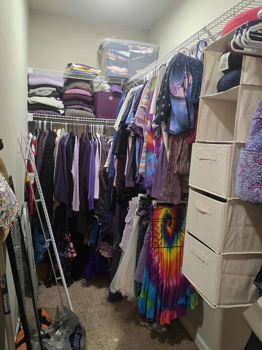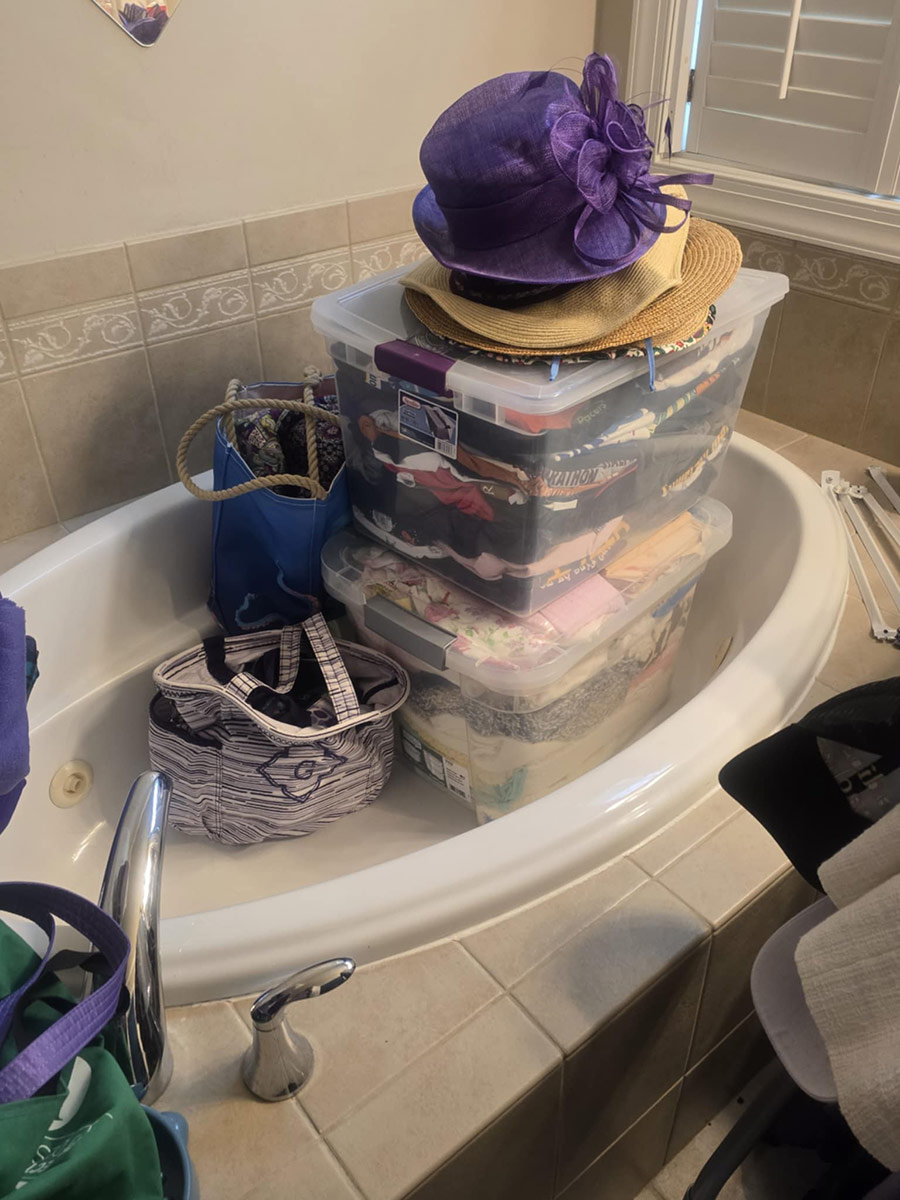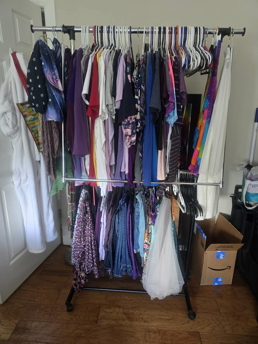 - Thankfully I had some existing organization in here that made this easier to manage. There were three plastic totes. Originally, they kept the closet door from opening all the way, but once I got their contents reassembled, it got a lot of stuff out of the way quickly. I had all of my handbags on a little hanger thing, so I could extricate all of them at once. And of course my garment rack came in clutch. It’s listing pretty hard to starboard, so I’m actually about to run to Lowes and grab a second one. Not a lot of junk or trash, which was kind of a surprise. I felt like this was an area where doom bags/boxes sometimes go to die.
