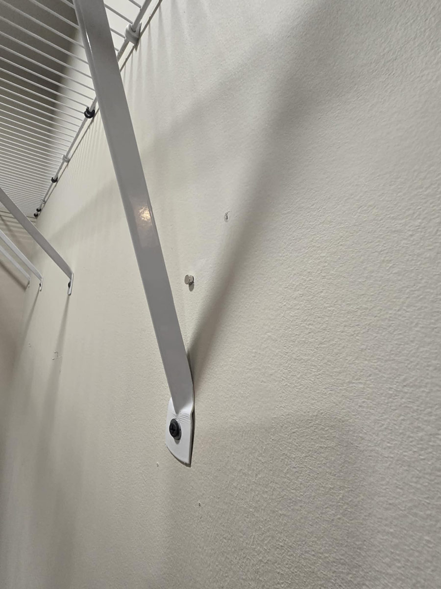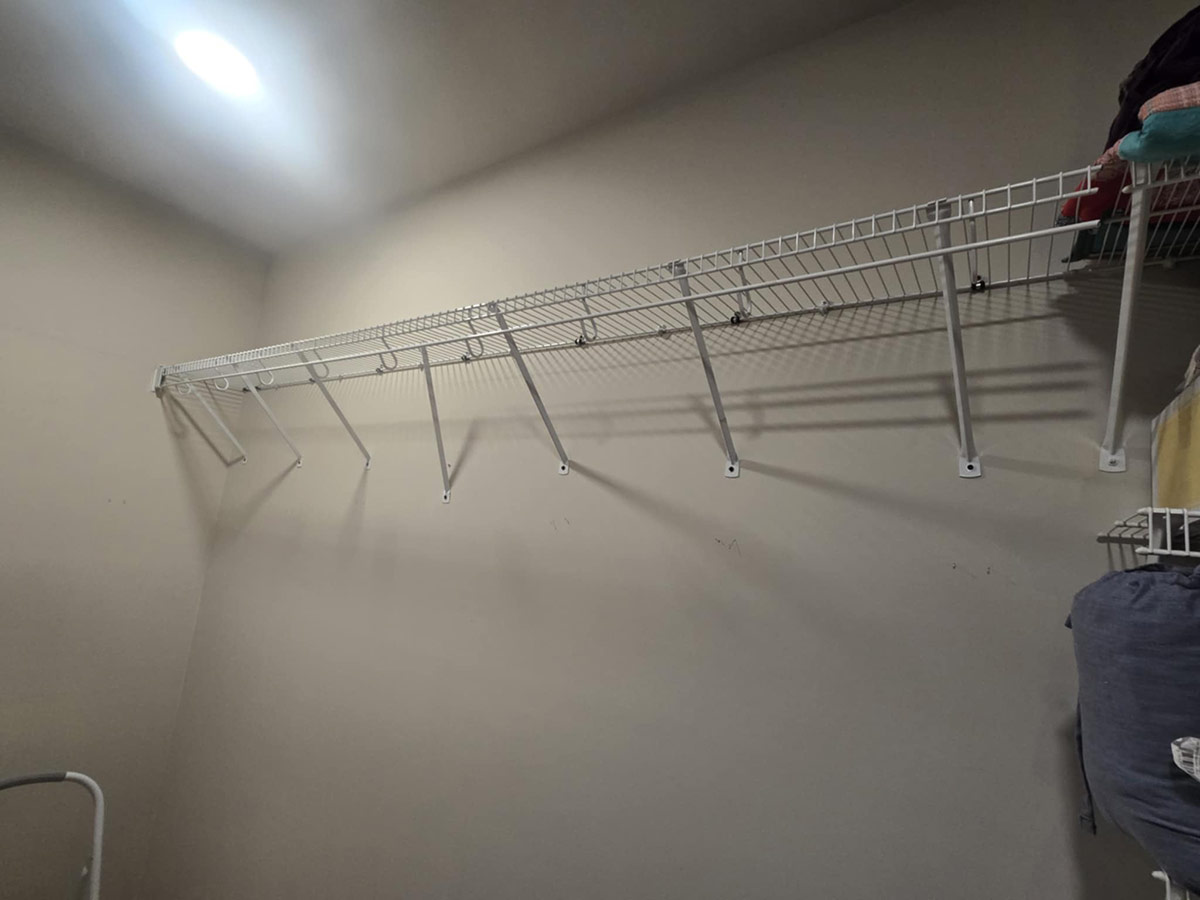 - So, here’s where the closet currently stands. Hard to tell whether the little plastic hangers or the wall anchors gave up the ghost first. Ultimately, I guess it doesn’t much matter. Mike is going to attach a wood strip to the studs and use beefier anchors and mounting clips. The rack I got at Lowes last night was way sturdier. I transferred everything from my little foldable rack onto it. The one support bar is at a different angle because there was a screw holding the stud to the framing directly where Mike was trying to screw that support.