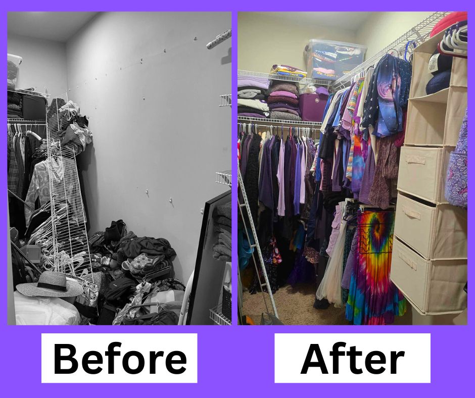 My cousin recently sent me a message from Europe with a story that perfectly captures the ups and downs of organizing. While she was away, her closet shelving brackets “gave up the ghost”! She had seen some of the “before and afters” I had posted online and joked that she suddenly had a “before” of her own. What I love most is the humor and honesty in how she described the process of tackling this project at home with her husband. It’s such a great reminder that organizing isn’t always glamorous. Sometimes it’s problem-solving, improvising with what you already have, and being willing to laugh at the chaos along the way. She very kindly agreed to let me share her story here, in her own words, to inspire you in your own organizing journey.
